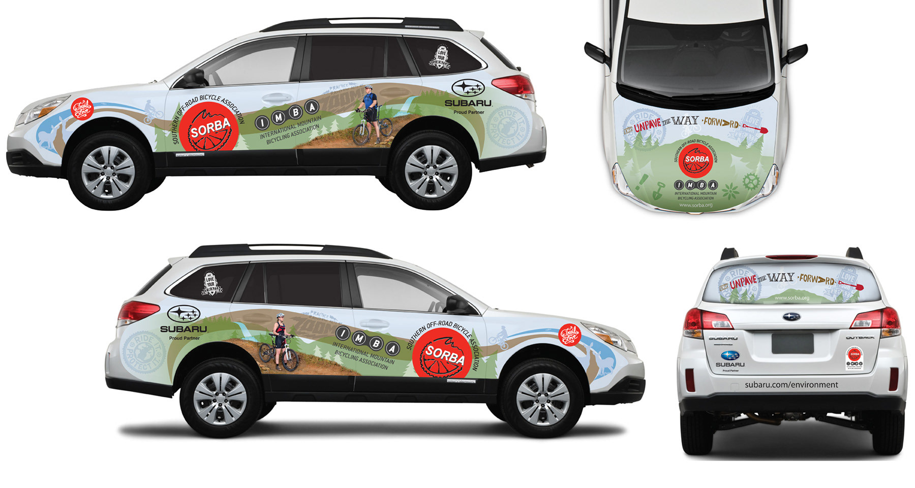 SORBA, The Southern Off-Road Bicycle Association, a regional chapter of IMBA, The International Mountain Biking Association, approached me to design a vehicle wrap for their Subaru sponsored car. The design incorporates visual elements of both organizations. In addition to the layout and design I also provided the photography of the riders.